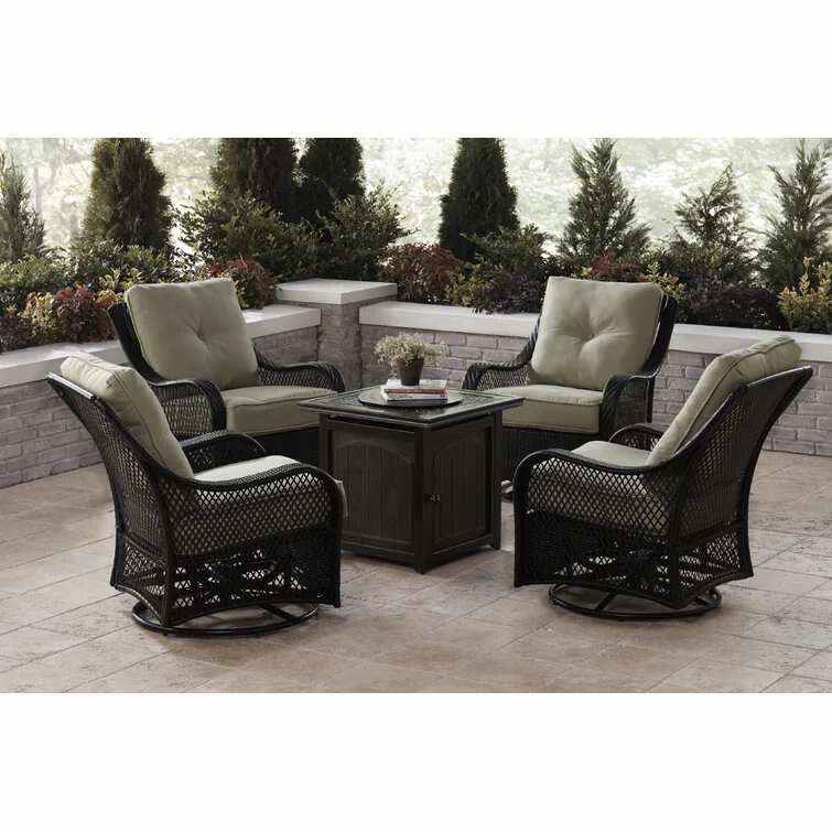 • Set includes 4 deep-seating swivel gliders and a 30,000 BTU fire pit table