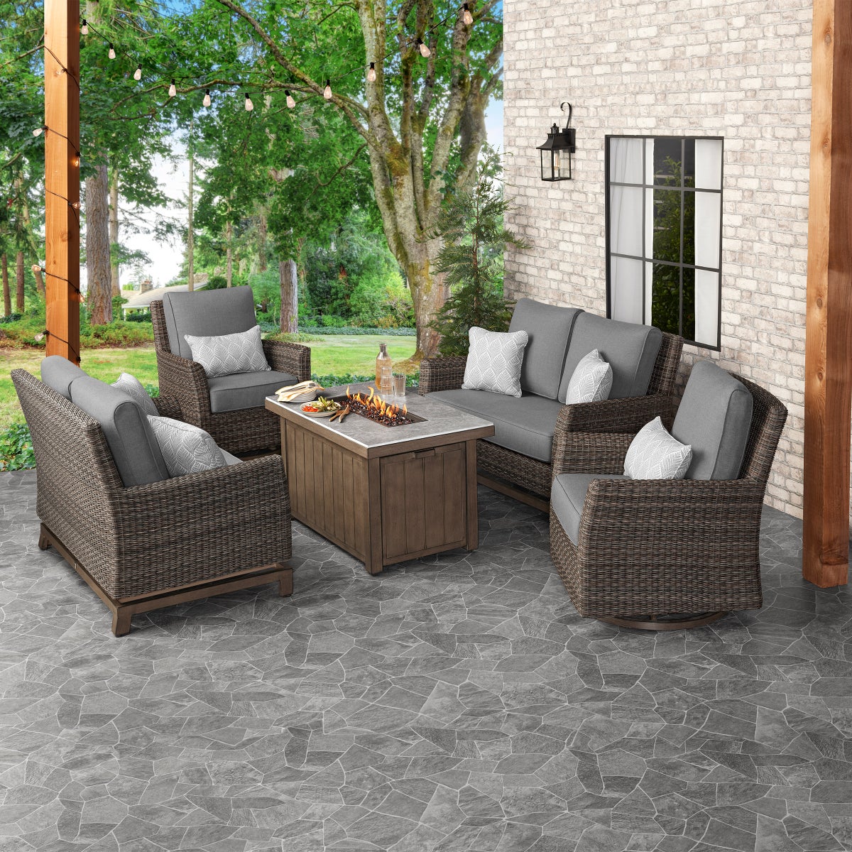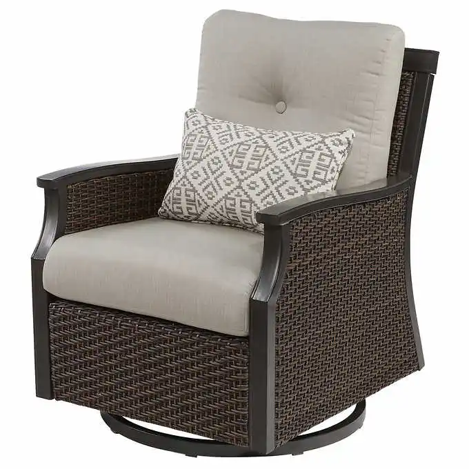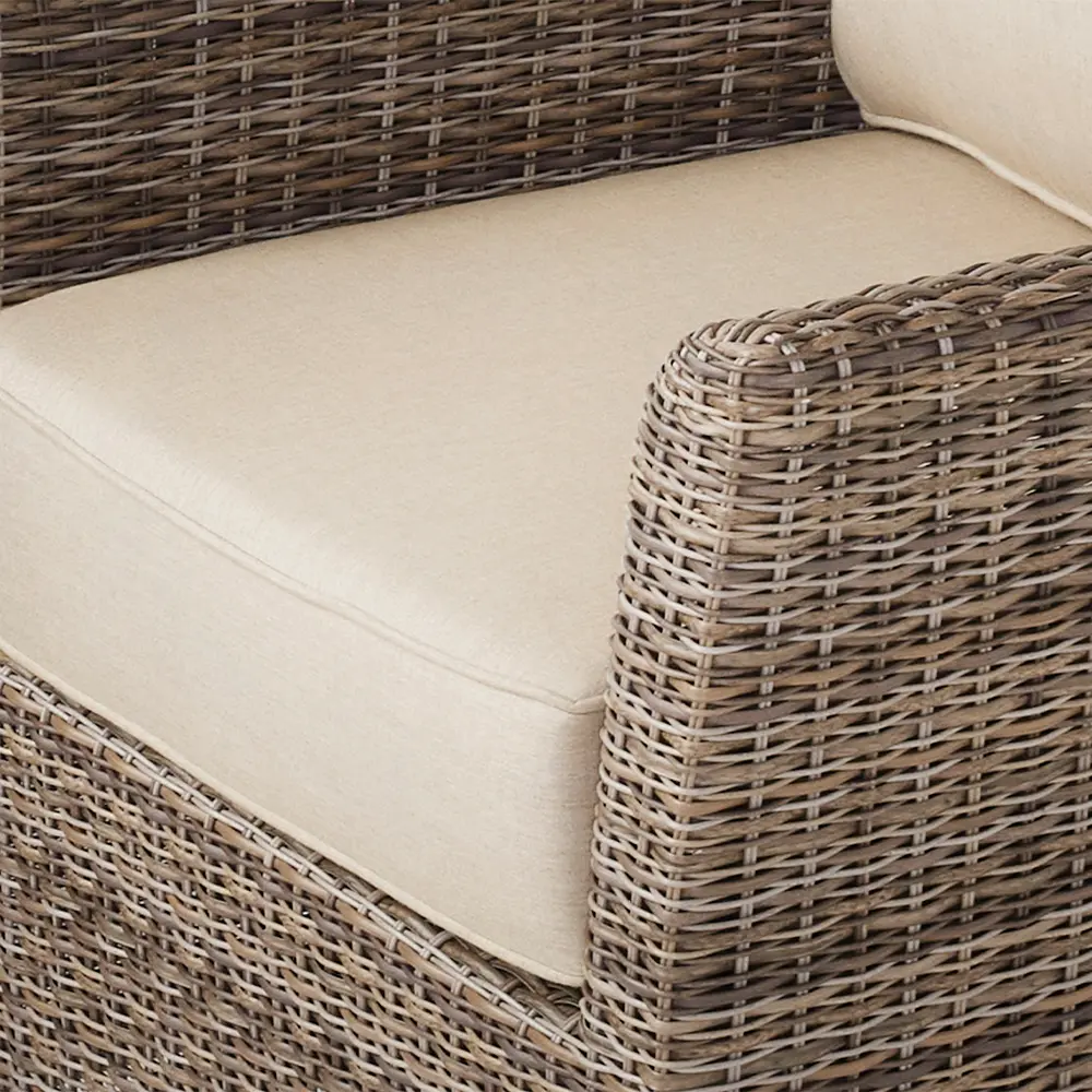 Nothing says relaxation more than spending time outdoors enjoying the company of friends. Serve up some snacks and put your style on display with the Conway 4-piece Woven Deep Seating Set. The sofa, two swivel glider chairs and coffee table all feature an elegant handwoven, all-weather wicker over rust-resistant aluminum frames for long-lasting beauty. The multi-toned wicker is accompanied by deep seating cushions and accent pillows of UV-resistant Sunbrella® fabric for years of easy-care comfort. The coffee table provides ample space for serving up snacks and drinks while entertaining includes a handwoven shelf for convenient storage. Sit back and relax in your new Conway 4-piece Woven Deep Seating Set.