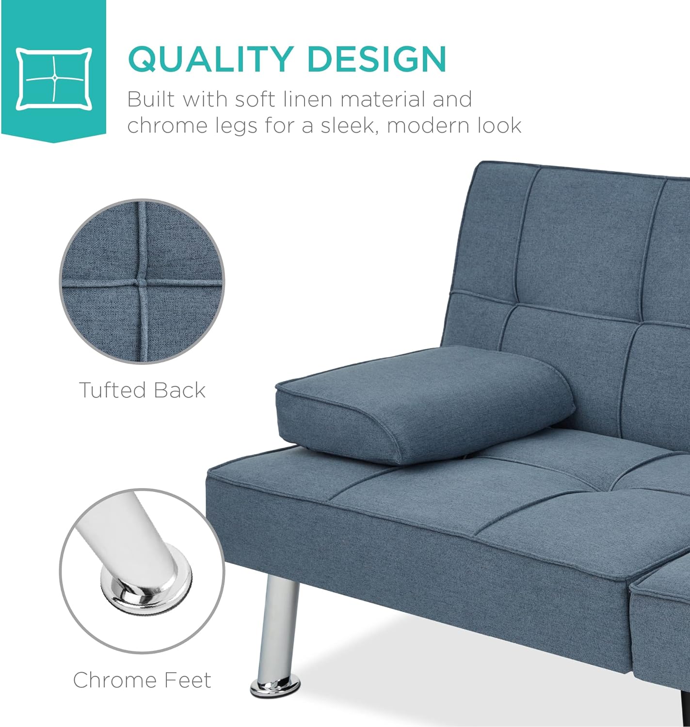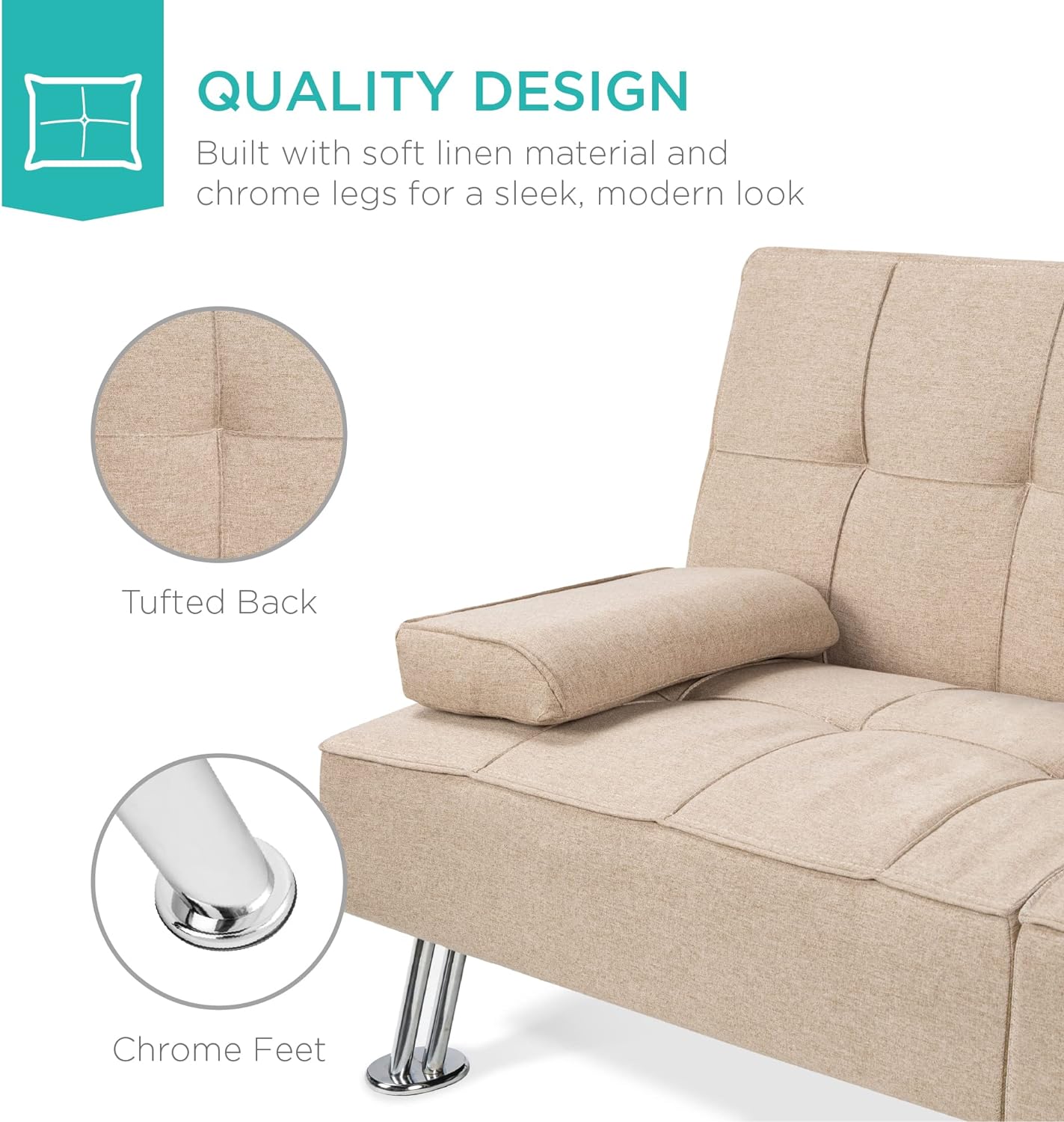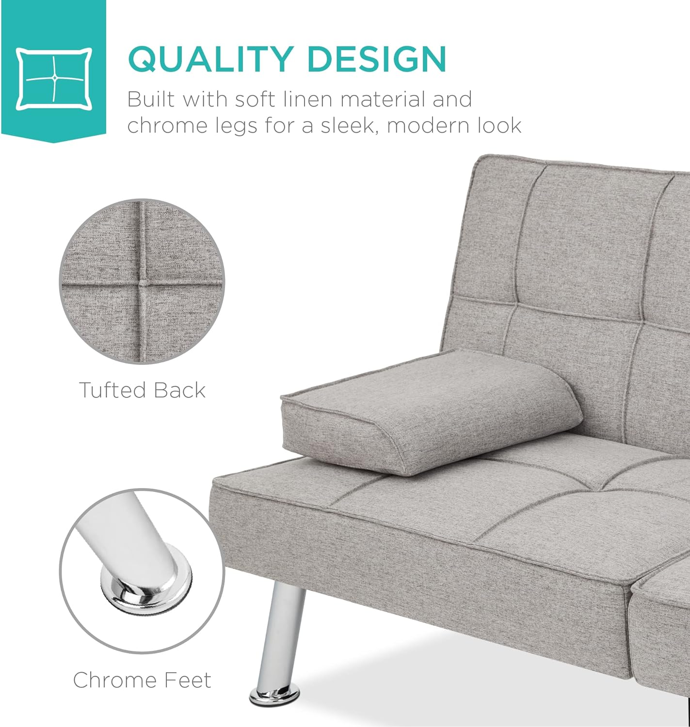 • QUALITY DESIGN: Durably crafted with tufted linen and 4 chrome metal legs, this convertible futon sofa fuses comfort and style that will last in your living space for years to come