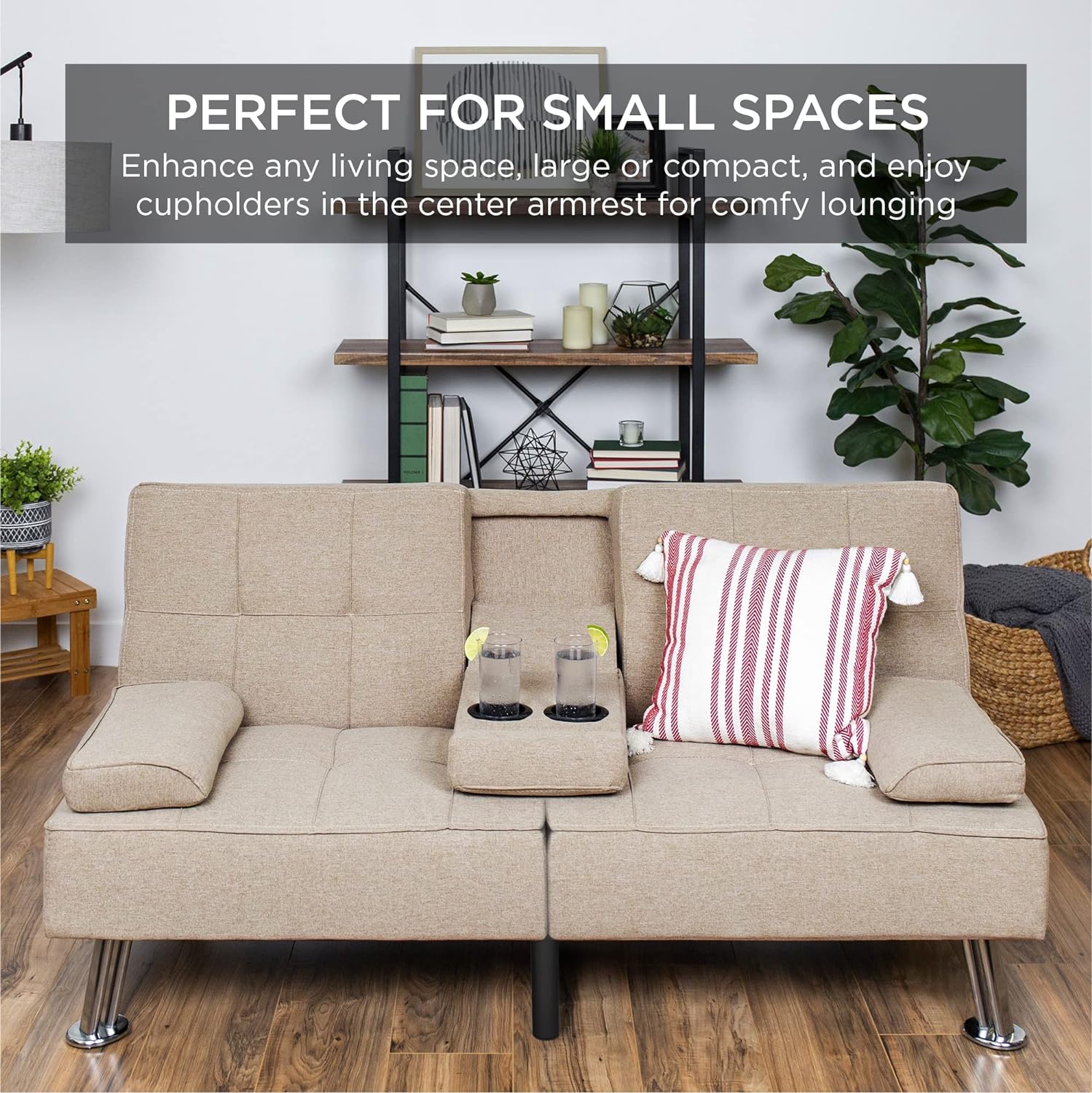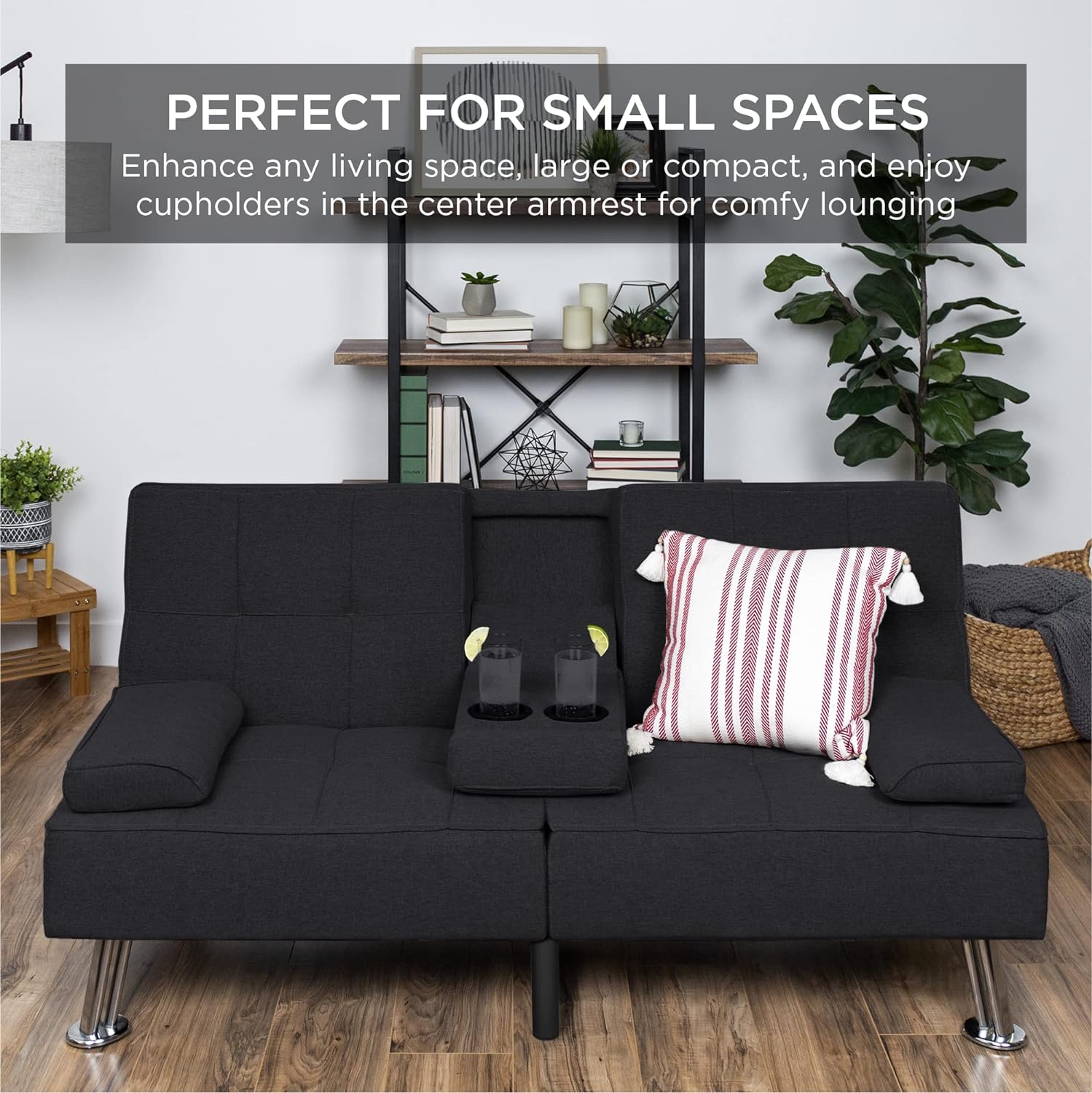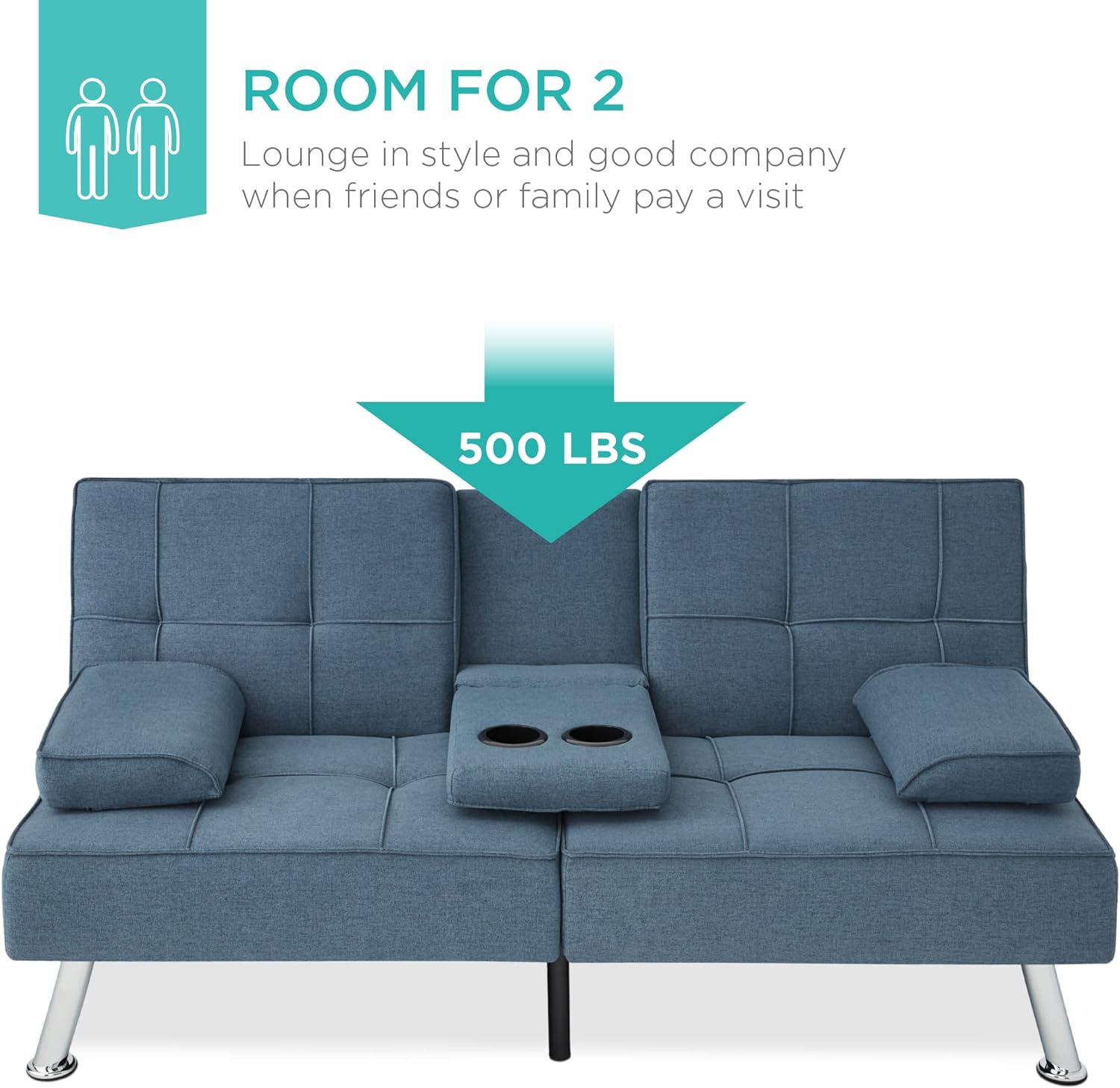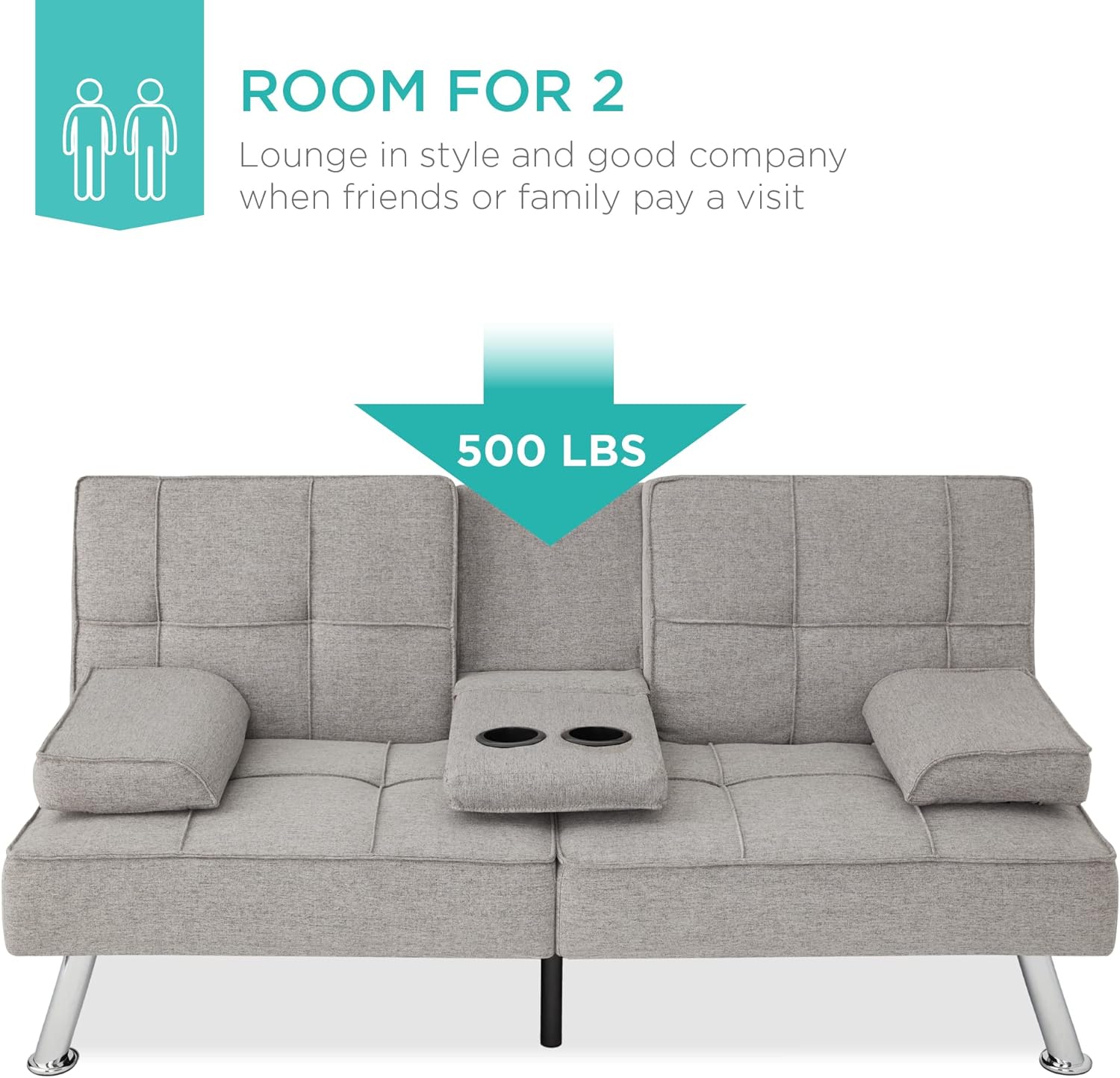 • ROOM FOR 2: This stylish futon sofa has a 500-pound weight limit that lets you lounge in good company while utilizing a fold-down armrest with convenient cupholders in the middle