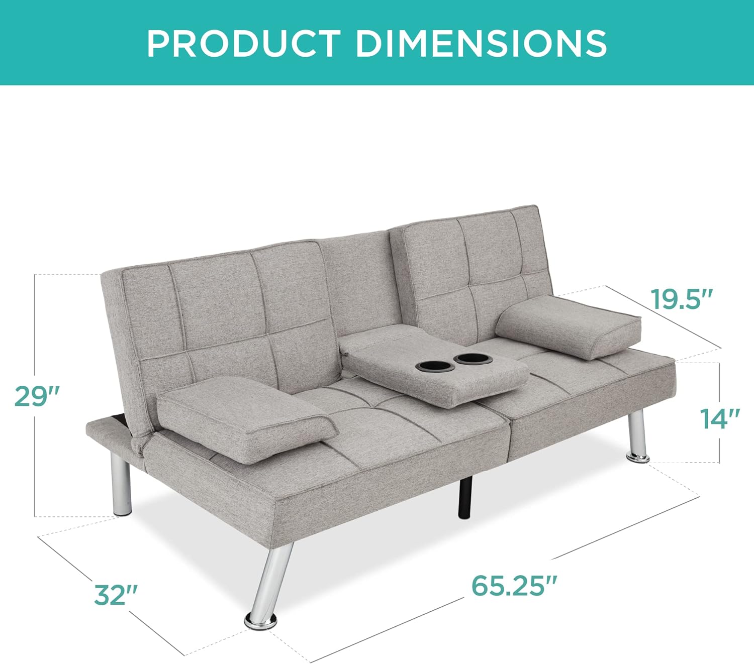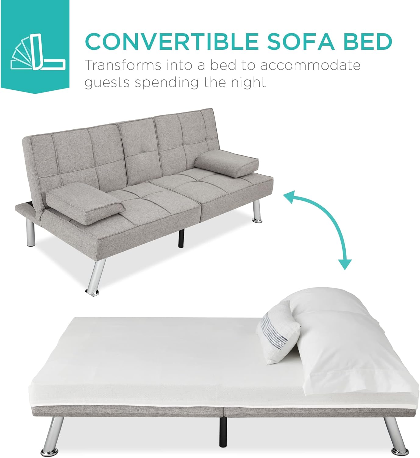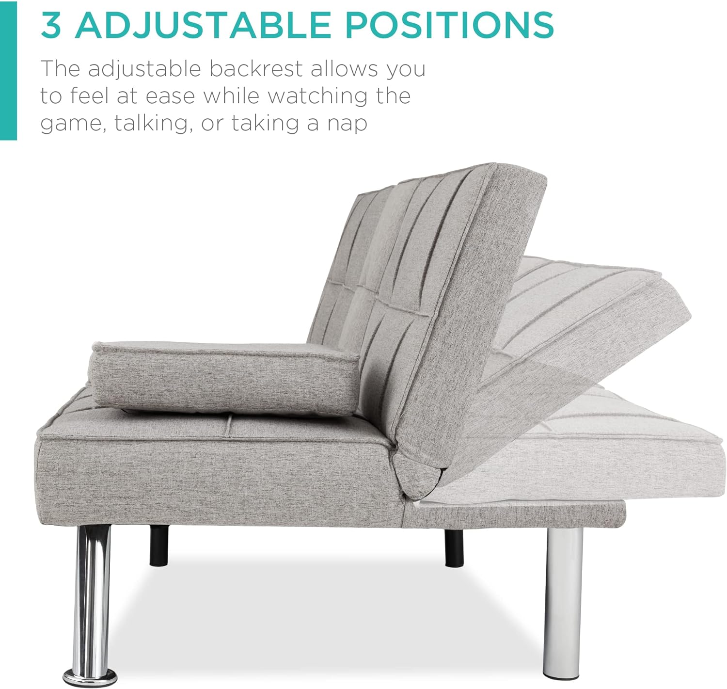 • Best Choice Products Linen Upholstered Modern Convertible Folding Futon Sofa Bed for Compact Living Space, Apartment, Dorm, Bonus Room w/Removable Armrests, Metal Legs, 2 Cupholders - Gray