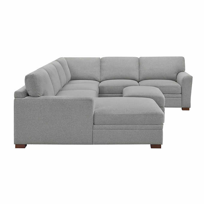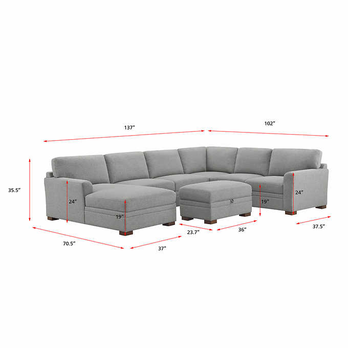 The Thomasville Langdon Sectional with Storage Ottoman offers quality features in fabric, construction, and styling. The sectional is covered in a smooth fabric that is composed of durable fibers. The comfort of this sectional goes beyond the fabric and into the cushion construction due to pocket coils and sinuous springs. The pocket coils and sinuous springs will provide consistent comfort and maintain great shape over time. The “U” shape configuration features a sofa-chaise, which allows for additional seating. The ottoman cushion pulls open to provide storage space for blankets, magazines, and more. Solid wood legs, in a rich walnut brown finish, complete the frame. The large scale of this sectional makes for the best living room centerpiece to accommodate all guests and family members.